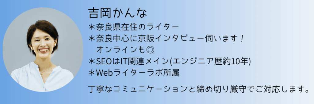取材方法はオンラインはもちろん、対面の場合は奈良中心に京都・大阪まで伺わせて頂きます。